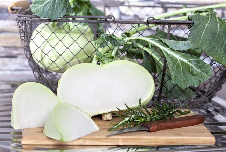 Kohlrabi überzeugt ebenfalls durch eine kurze Entwicklungszeit (Keimdauer 6-10 Tage). Die Kohlpflanze mit verdickter Sprossknolle wird entweder ab März im Warmen vorgezogen und ab April ins Freie gepflanzt oder ab Mitte April unter Folie direkt ins Beet gesät. Sie können zwischen weißen (hellgrünen) und blauvioletten Sorten wählen, wobei die weißen meist eine kürzere Kulturzeit haben.