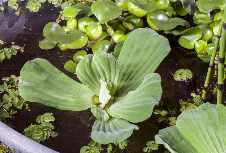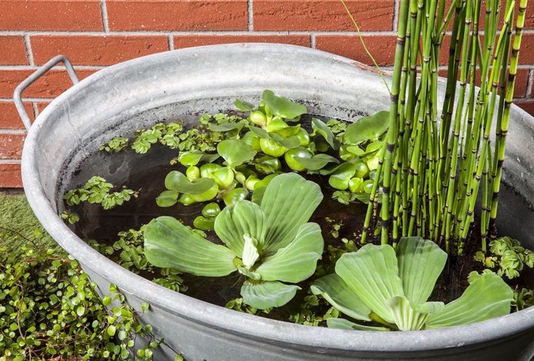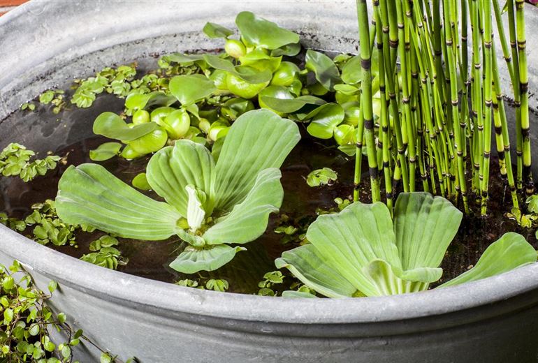 Damit die Pflanzkörbe im Mini-Teich stabil stehen können, wird der Grund des Gefäßes mit Kieselsteinen befüllt. Dann werden die Pflanzkörbe eingesetzt und diese ebenfalls mit weiteren Kieselsteinen fixiert. So schwemmen die Pflanzkörbe nicht aus und finden sich nicht plötzlich an der Wasseroberfläche wieder. Generell sollte darauf geachtet werden, dass die Wurzeln der Pflanzen frei von Erde sind. Je mehr Nährstoffe in den Mini-Teich gelangen, desto schwieriger wird es für das kleine Biotop, das ökologische Gleichgewicht aufrecht zu erhalten, das der Mini-Teich braucht, um sich quasi selbst zu pflegen. Deshalb sollte bei einem Mini-Teich auch unbedingt auf einen Fischbesatz verzichtet werden. Zum einen natürlich, damit der Mini-Teich nicht kippt, zum anderen aber auch, weil ein kleiner Teich nicht den nötigen Platz bietet, damit die Fische einen artgerechten Lebensraum bekommen. Ein Fischbesatz ist eher für den großen Bruder, dem Gartenteich, geeignet. Leben kommt durch die Bepflanzung in den Mini-Teich. Kleinwüchsige und schmalblättrige Pflanzen wie Iris, Pfeilkraut und Riedgras eignen sich perfekt für die Bepflanzung im Mini-Teich und werden vom Besitzer so klein wie möglich gehalten. Auf der Wasseroberfläche sorgen dann, je nach Größe des Mini-Teiches, Wassersalat, Wasserhyazinthen oder Wasserlinsen für Farbe und schwimmen munter auf dem Mini-Teich.